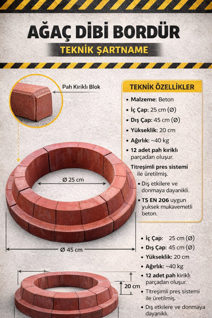 Ağaç dibi bordürler; dış mekân koşullarına dayanıklı, yüksek mukavemetli beton kullanılarak üretilmiş, ağaç kök bölgesini korumaya yönelik beton peyzaj elemanlarıdır.