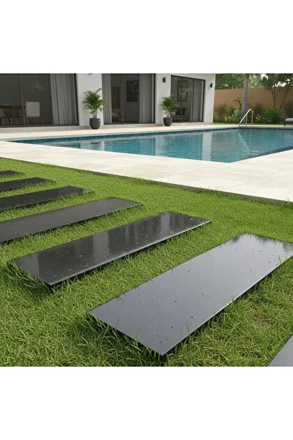 Bazalt adım taşı 30×60, volkanik kökenli doğal taş yapısıyla en dayanıklı adım taşı seçeneklerinden biridir. Koyu rengi ve doğal dokusu sayesinde modern ve prestijli bir görünüm sunar. Görselde de görüldüğü gibi peyzaj projelerinde güçlü bir kontrast oluşturur.